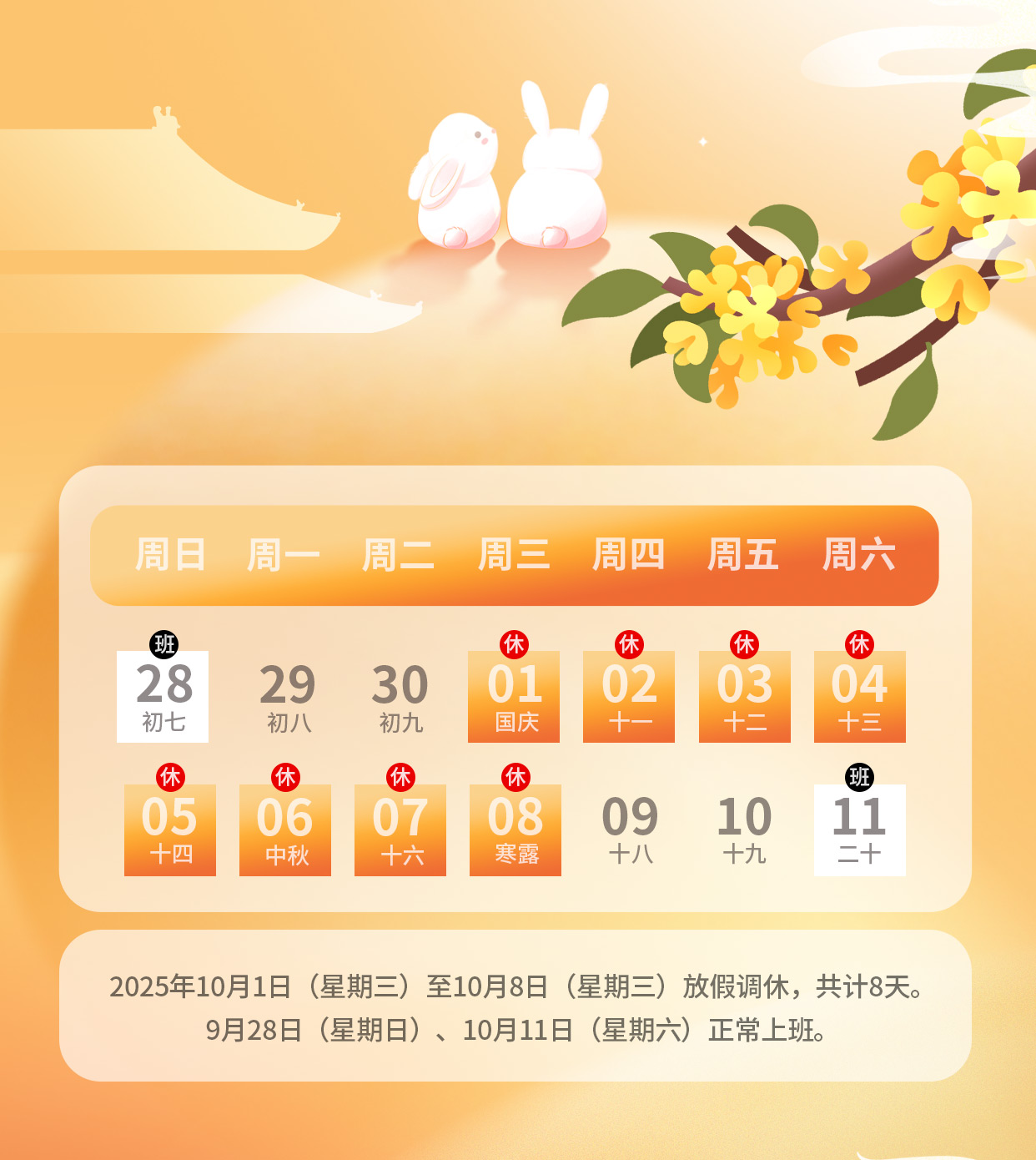 2025年10月1日(星期三)至10月8日(星期三)放假调休,共计8天。